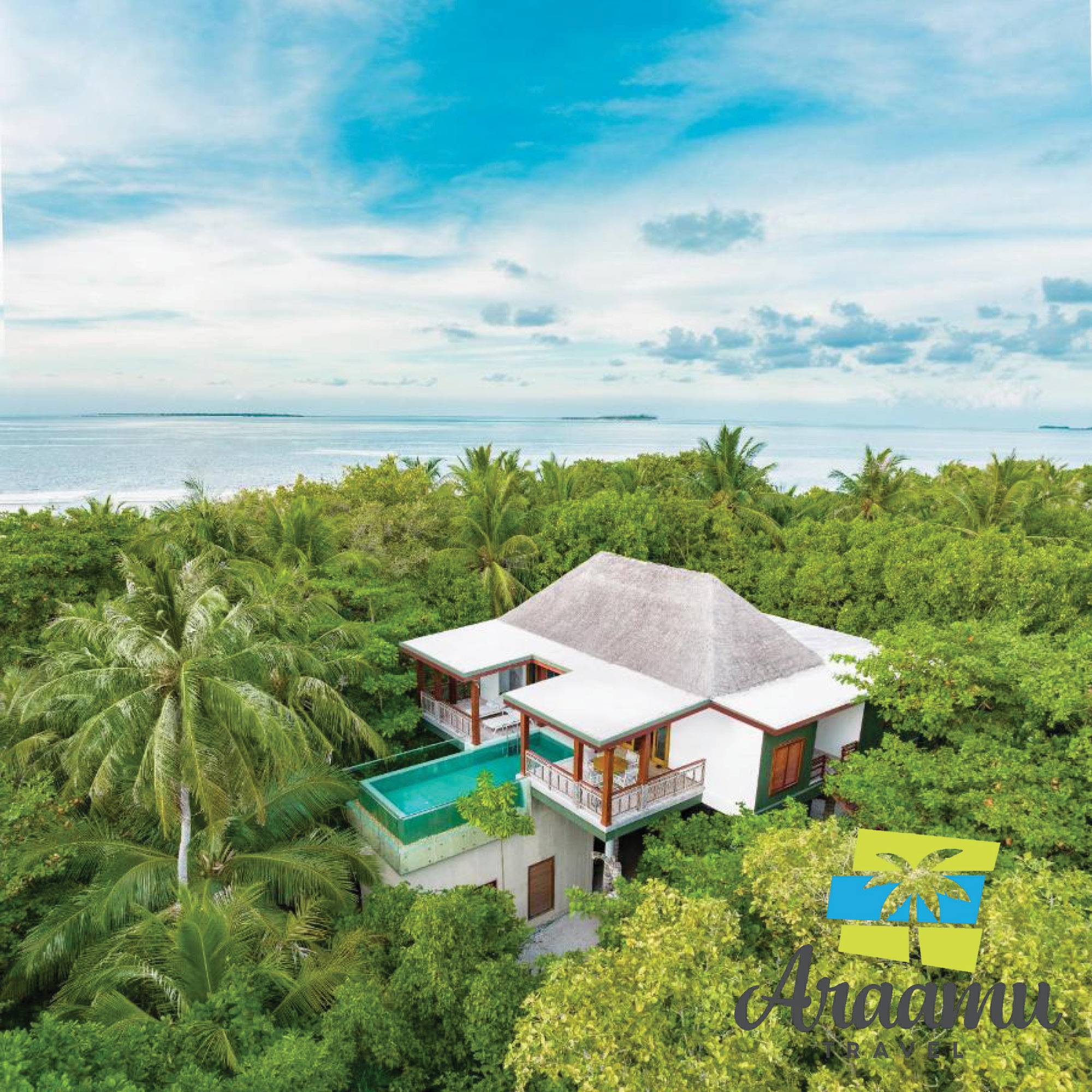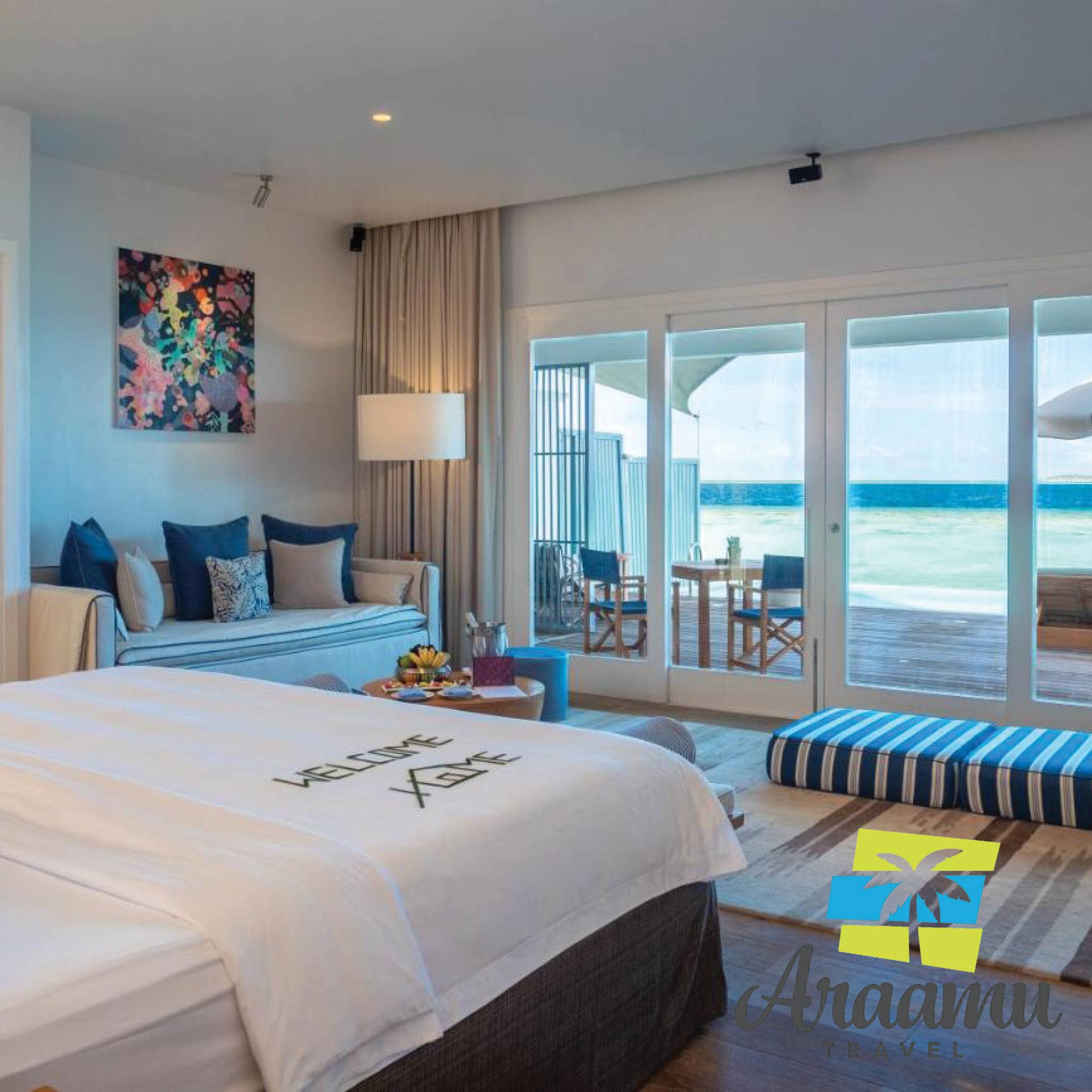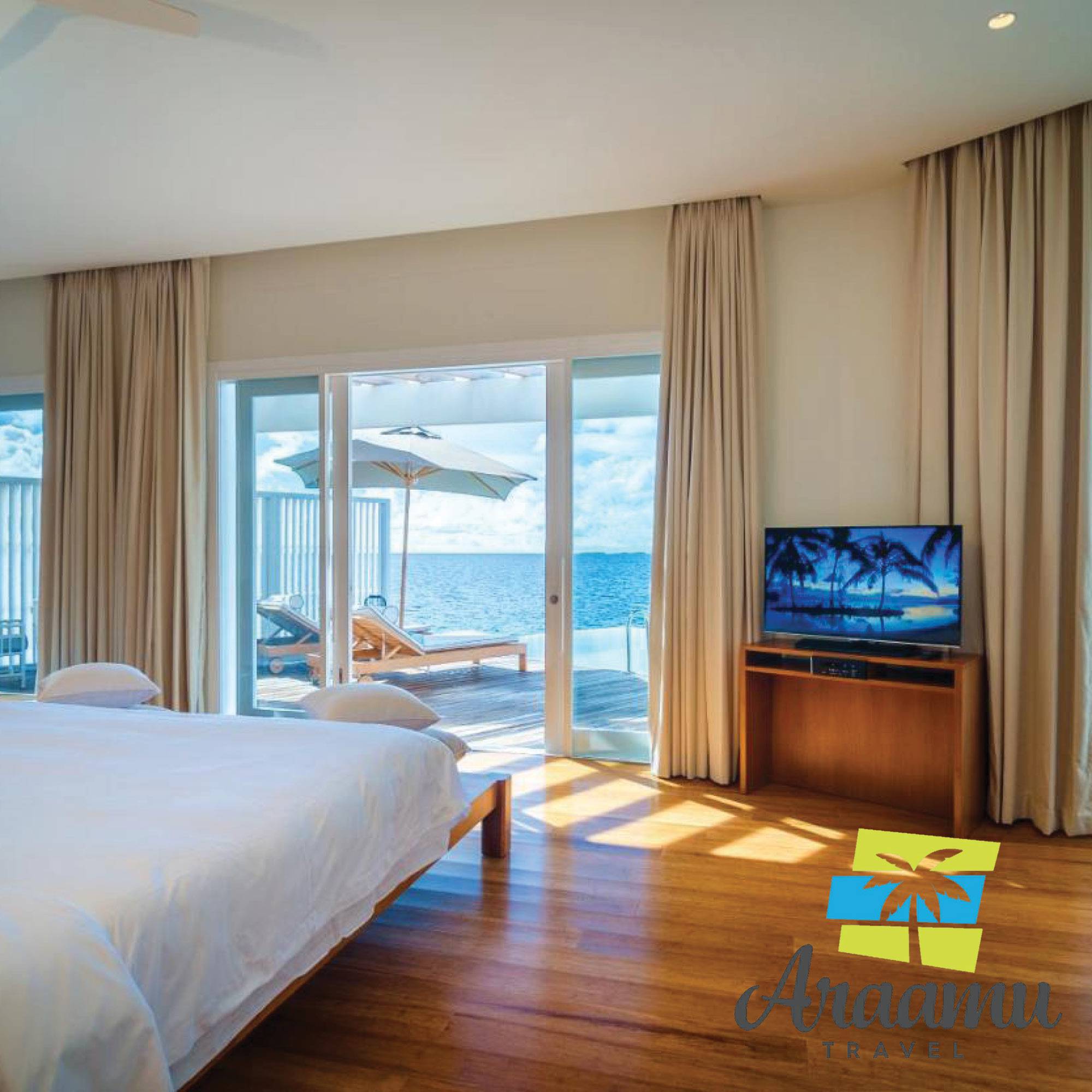 Family 2 Bedroom Ocean Lagoon House: 5 db kb. 400 nm, terasz 60 nm, 2 hálószobás családi bungaló, amely felszereltségében megegyezik a fenti szobatípusokkal, az egyik hálószoba külön fürdőszobával.