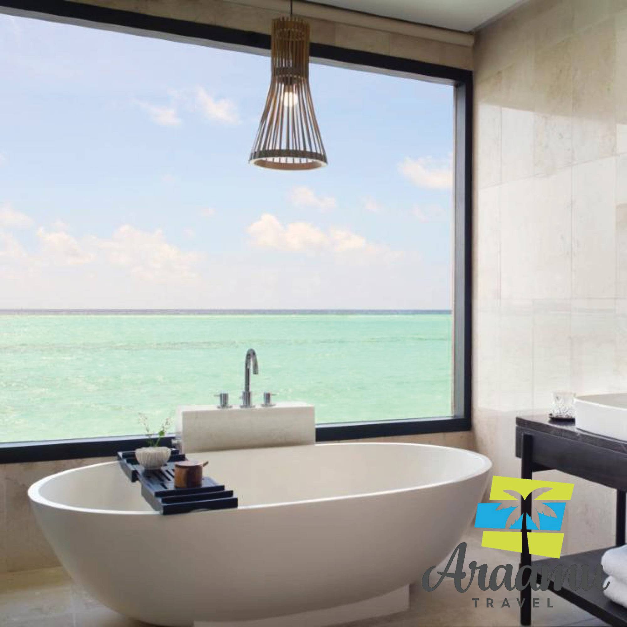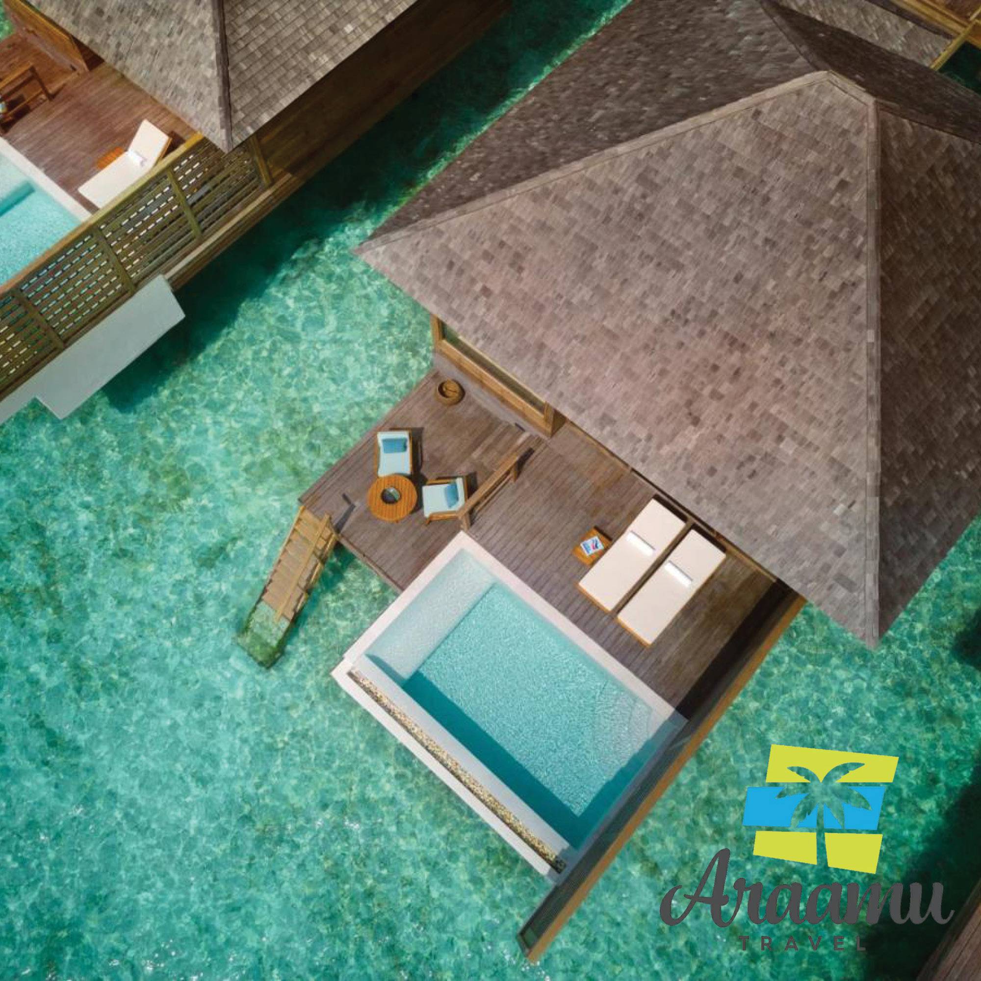 Ocean bungalow medencével (kb. 125 nm), részben a szigeten és részben az óceán találkozásánál helyezkedik el, nagyobb privát szférát biztosít, valamint komornyik szerviz, kültéri zuhanyzó, privát medencével rendelkező terasz is tartozik hozzá. Nincs közvetlen lejárat a bungalowból a vízbe.