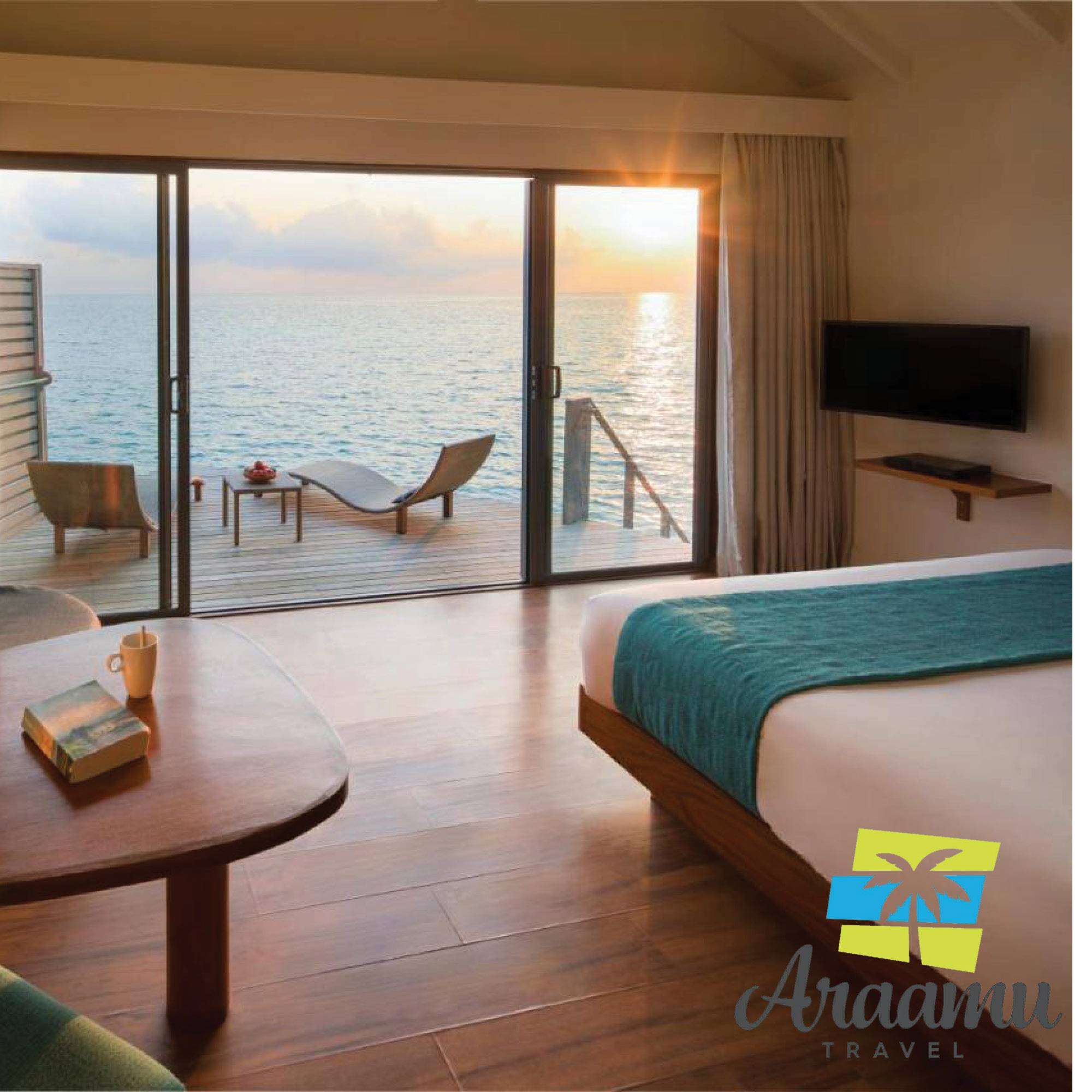 Deluxe Sunset Water Villa: 26 db, 42 nm-es víz fölé épült bungaló. Felszereltségben teljesen megegyezik a Deluxe Water Villa szobatípussal, csak a sziget naplementés oldalán.
