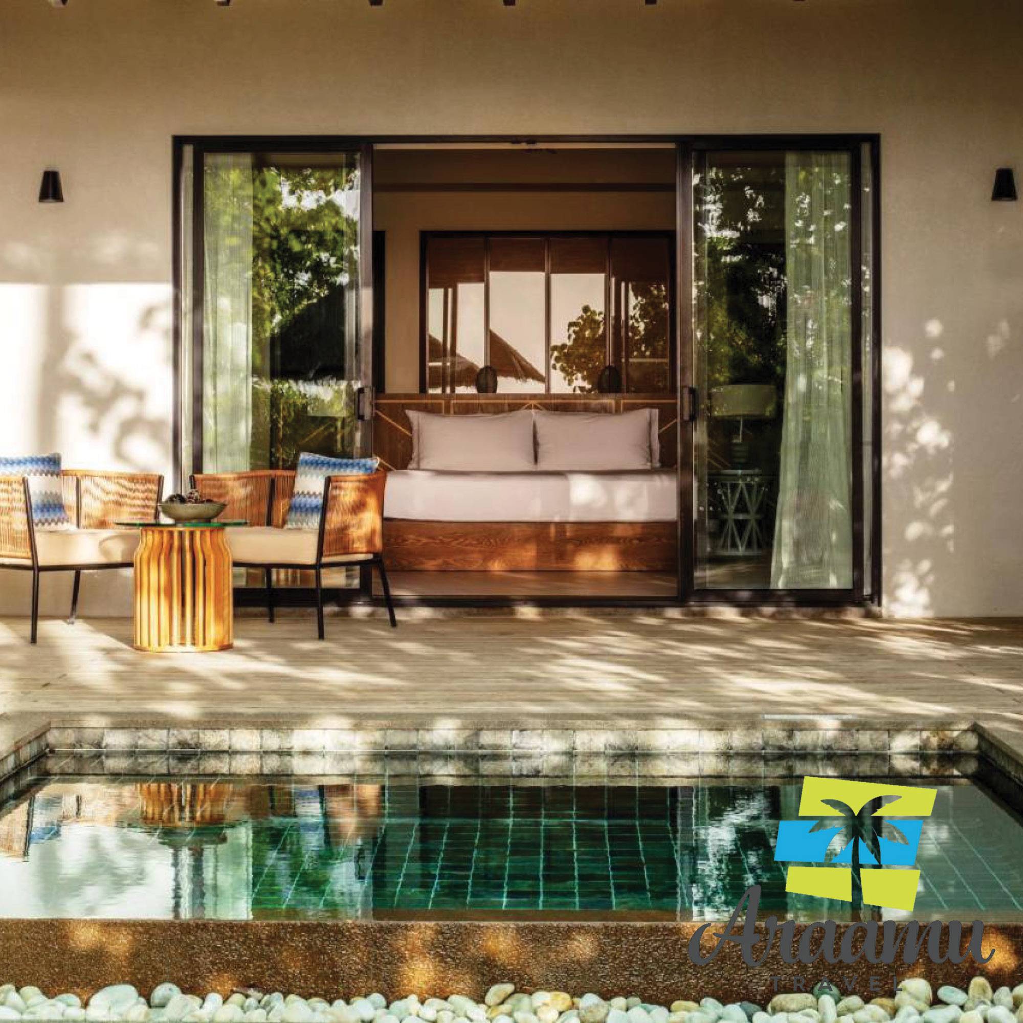 Beach Pool Villa: 6 db, 120 nm-es villa, privát medencével, amely felszereltségben megegyezik a fenti szobatípusokkal. A sziget mindkét oldalán megtalálhatóak.